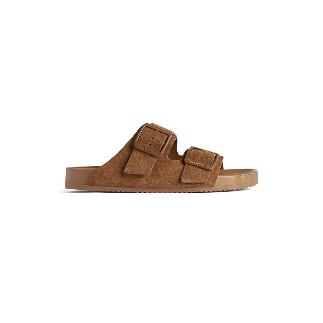 Sunday Sandal in brown suede calfskin PRODUCT DETAILS • Suede calfskin • Sandal • Five toe anatomical shape • Two leather straps with adjustable belt buckles • Balenciaga logo engraved on each buckle • Debossed Balenciaga logo on sole part • Tone-on-tone sole and insole • Made in Italy Material: calfskin