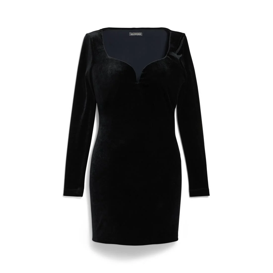 Sweetheart Dress in black stretch velvet jersey PRODUCT DETAILS • Stretch velvet jersey • Sweetheart neckline • Long sleeves • Cinched waist • Invisible zip at side • Made in Italy Main material: 78% viscose, 20% polyamide, 2% elastane