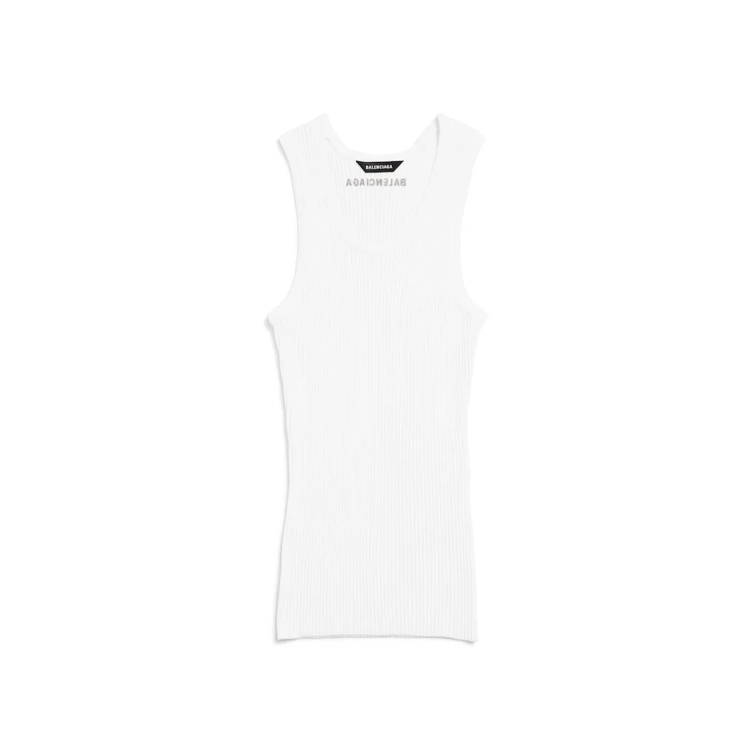 Tank Top in white classic knit wool PRODUCT DETAILS • Classic rib knit • Crewneck • Sleeveless • Ribbed finishing • Balenciaga logo embroidered at back • Made in Italy Main material: 90% wool, 8% polyamide, 2% elastane