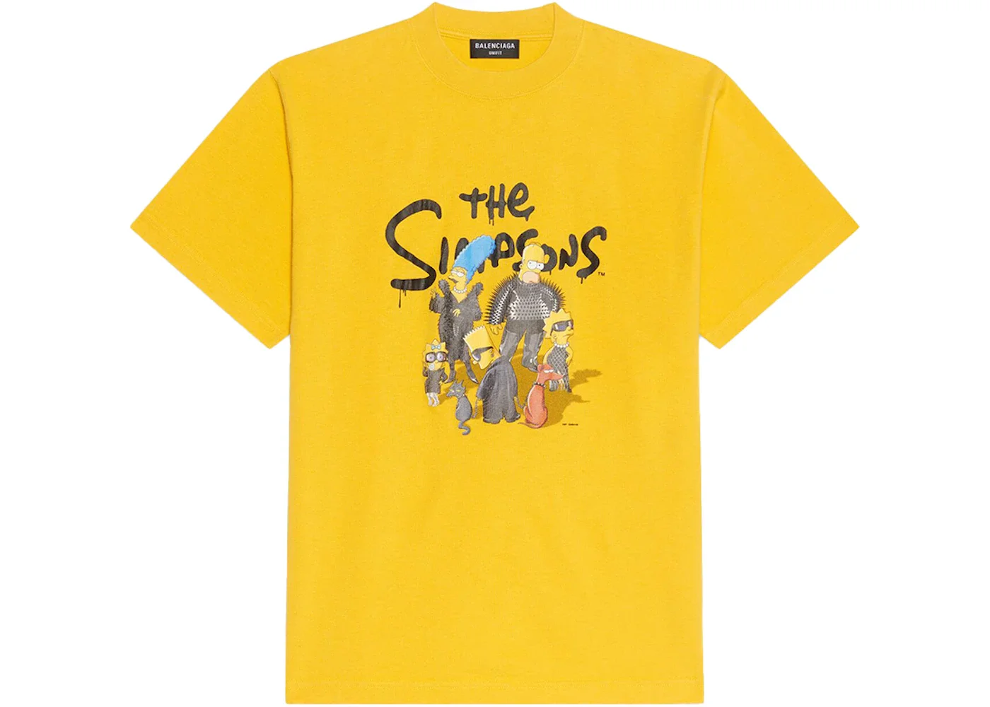 T-Shirt Small Fit in yellow vintage jersey with an artwork reference to The Simpsons TM & © 20th Television family dressed in recognizable Balenciaga pieces from past seasons. PRODUCT DETAILS • Vintage jersey • Small fit • Crewneck • The Simpsons artwork printed at front TM & © 20th Television • Crakling effect artwork • Balenciaga logo embroidered tone-on-tone at back • Made in Portugal • Cold machine wash • Model is 177 cm / 5'80'' and is wearing a FR size S Material: 100% cotton