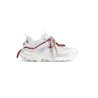 Track Trail Laces Sneaker in white, red, grey and black polyurethane, polyester and polyamide PRODUCT DETAILS • Leather free • Sneaker • Polyurethane, polyester and polyamide • Written size at the edge of the toe • Track debossed at the back of the heel • BB logo debossed on front of the outsole • Printed Balenciaga logo on the exterior • Debossed logo on the tongue • Laces with cord lock at back • Double laces knotted in a usual equipment way • Back and tongue pull-on tab • Dynamic sole design with an augmented back for more comfort • Made in China Upper: polyurethane, polyester, polyamide - Sole: rubber, EVA, TPU - Insole: gel