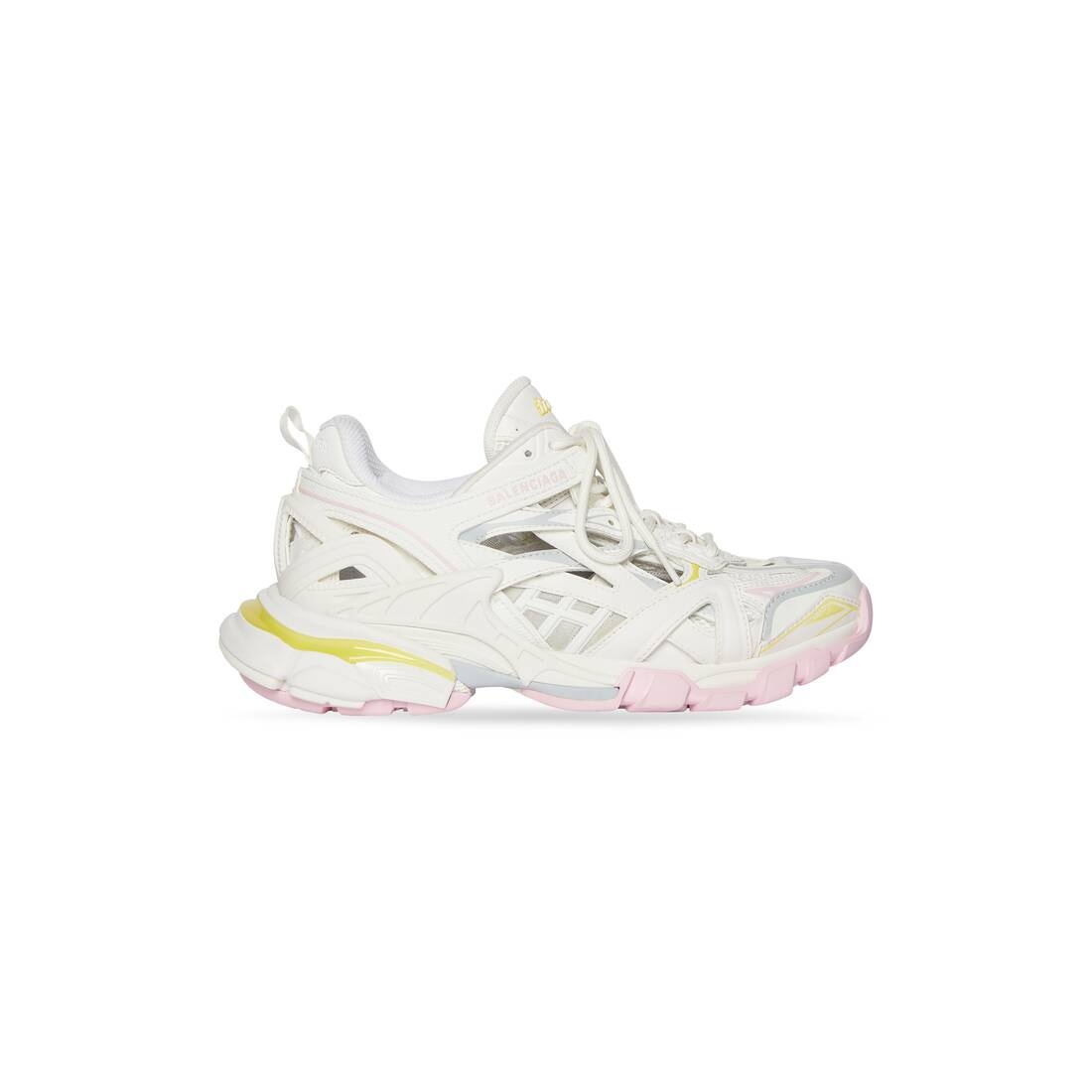 Track.2 Sneaker in white, light yellow, light pink and light blue mesh and nylon PRODUCT DETAILS • Leather free • Sneaker • Mesh and nylon • Track.2 rubber logo attached to the shoe tongue • Rubber logo on the exterior • Balenciaga logo embossed at the back of the heel • BB embossed on front of the outsole • Back pull-on tab • Dynamic sole design with an augmented back to propel feet forward • 1 additional pair of laces included • Made in China • Wipe with a soft cloth Material: 80% polyurethane, 15% polyester, 5% nylon