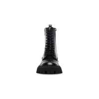 Tractor 20mm Lace-Up Boot in black smooth calfskin PRODUCT DETAILS • Smooth calfskin • Combat boot • Chunky design • Extra round toe • Tone-on-tone laces • Visible tone-on-tone top-stitching • 11 eyelets lace-up vamp • 20mm arch • Aged-gold hardware • Zip-fastening on each side • Leather loop at back • Thick toothed rubber outsole •Embossed logo on the upper, underneath the laces • Made in Italy • Wipe with a soft cloth Material: 100% calfskin