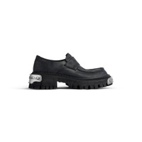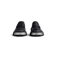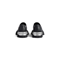 Tractor Loafer in black calfskin PRODUCT DETAILS • Calfskin • Loafer • Worn-out effect • Chunky design • Extra round toe • Visible tone-on-tone top-stitching • Front and back plate with Balenciaga logo • 20mm arch • Thick toothed rubber outsole • Logo debossed on the upper • Made in Italy Upper: calfskin - Sole: TPU - Insole: calfskin