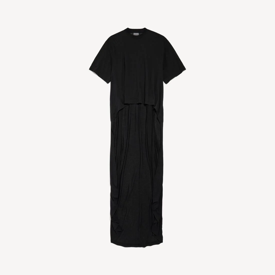 Train T-Shirt in black transparent jersey is from look 6 of Balenciaga's Summer 26 Collection. PRODUCT DETAILS • Sheer lightweight jersey • Slightly cropped front with dramatic maxi train at the back • Crewneck • Wide short sleeves • Made in Portugal Main material: 100% cottonr