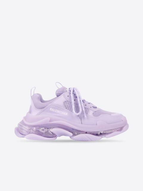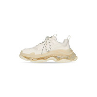 Triple S Sneaker Clear Sole in light beige double foam and mesh PRODUCT DETAILS • Leather free • Sneaker • Double foam and mesh • Complex 3-layered outsole, Clear Sole technology • Embroidered size at the edge of the toe • Embroidered logo on the side • Embossed logo in the back • Triple S rubber branding on the tongue • 2 laces loops including 1 functional • Athletic lacing system featuring 12 fabric eyelets • Bicolor laces recalling hiking boots’ laces • 1 additional pair of laces • Back pull-on tab and tongue pull-on tab • Made in China • Wipe with a soft and dry cloth Material: 52% polyester, 48% polyurethane