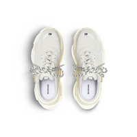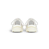 Triple S Mule in white double foam and mesh PRODUCT DETAILS • Leather free • Mule • Double foam and mesh • Triple S front and sole with open back • Complex 3-layered outsole • Embroidered size at the edge of the toe • Embroidered logo on the side • Embossed logo in the back • Triple S rubber branding on the tongue • 2 laces loops including 1 functional • Lacing system featuring 12 fabric eyelets • Bicolor laces recalling hiking boots’ laces • 1 additional pair of laces • Tongue pull-on tab • Made in China • Wipe with a soft and dry cloth Material: 52% polyester, 48% polyurethane