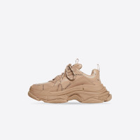 Triple S Sneaker Allover Logo in dark beige technical material PRODUCT DETAILS • Leather free • Sneaker • Technical material • Printed Balenciaga allover logo • Complex 3-layered outsole • Embroidered size at the edge of the toe • Embroidered logo on the side • Embossed logo in the back • Triple S rubber branding on the tongue • 2 laces loops including 1 functional • Athletic lacing system featuring 12 fabric eyelets • Bicolor laces recalling hiking boots’ laces • 1 additional pair of laces • Back pull-on tab and tongue pull-on tab • Made in China • Wipe with a soft and dry cloth Material: 95% polyurethane, 5% polyester
