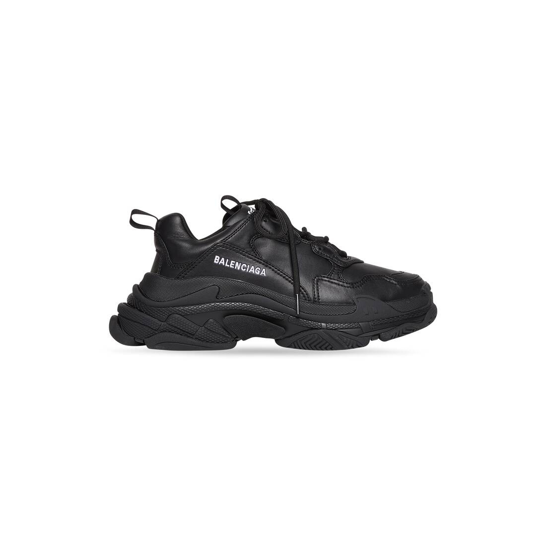 Triple S Sneaker in black technical material PRODUCT DETAILS • Sneaker • Fake leather • Complex 3-layered outsole • Embroidered size at the edge of the toe • Embroidered logo on the side • Embossed logo in the back • Triple S rubber branding on the tongue • 2 laces loops including 1 functional • Athletic lacing system featuring 12 fabric eyelets • 1 additional pair of laces • Back pull-on tab and tongue pull-on tab • Made in China • Wipe with a soft and dry cloth Material: 95% polyurethane, 5% polyester