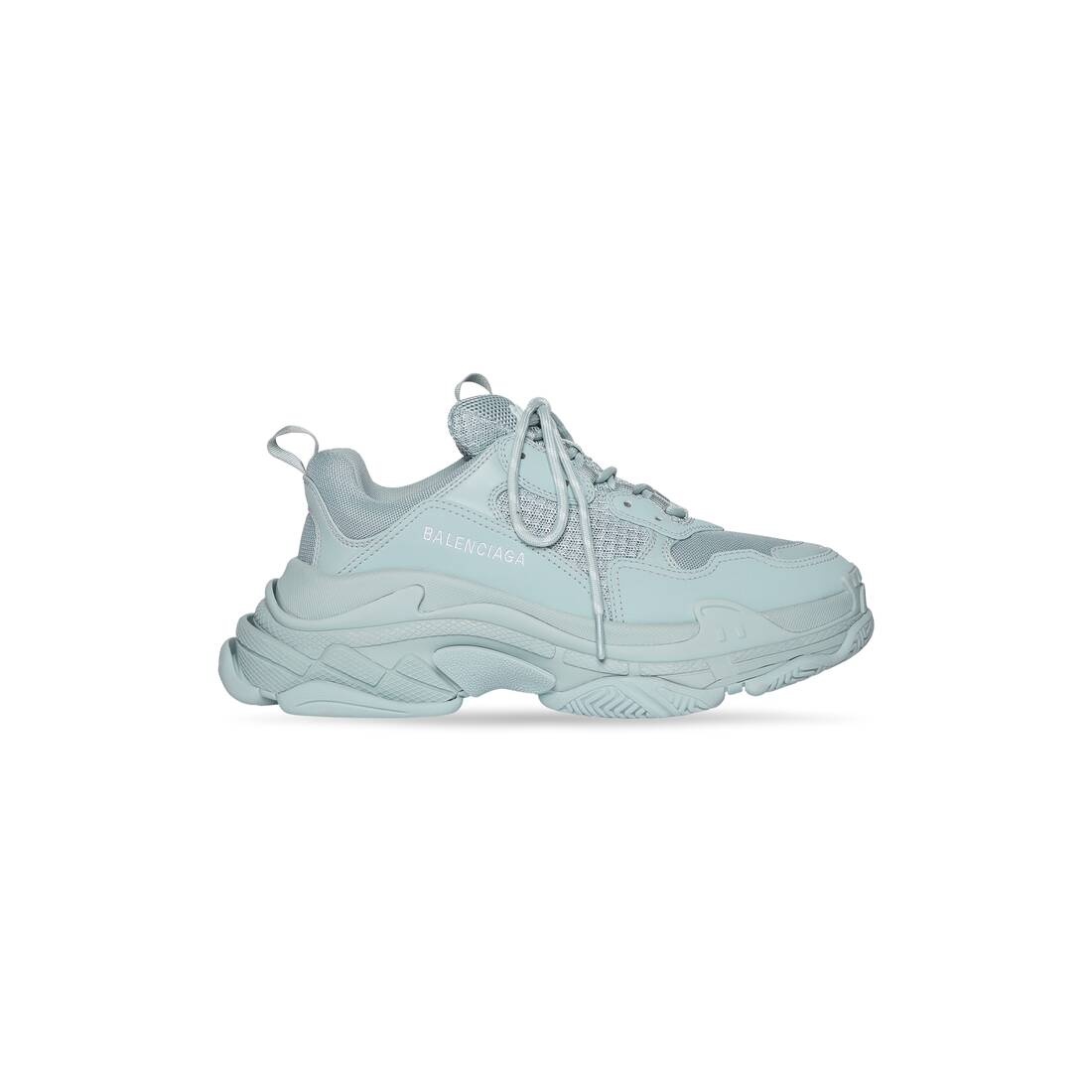 Triple S Sneaker in light blue double foam and mesh PRODUCT DETAILS • Leather free • Sneaker • Double foam and mesh • Complex 3-layered outsole • Embroidered size at the edge of the toe • Embroidered logo on the side • Embossed logo in the back • Triple S rubber branding on the tongue • 2 laces loops including 1 functional • Athletic lacing system featuring 12 fabric eyelets • Bicolor laces recalling hiking boots’ laces • 1 additional pair of laces • Back pull-on tab and tongue pull-on tab • Made in China • Wipe with a soft and dry cloth Material: 52% polyester, 48% polyurethane
