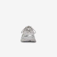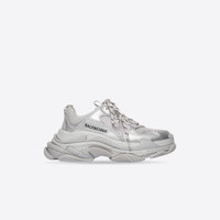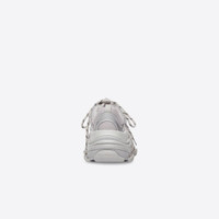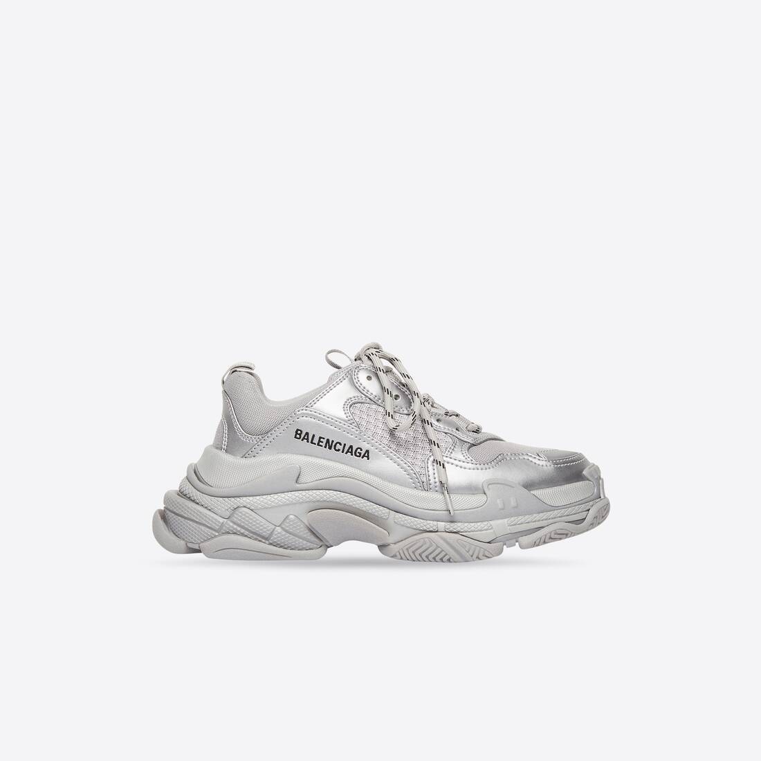 Triple S Sneaker in silver mettalic double foam and mesh PRODUCT DETAILS • Triple S Bold Balenciaga collectible Sneaker • Leather free • Double foam and mesh Sneaker • Embroidered size at the edge of the toe • Embroidered logo on the side • Embossed logo in the back • Triple S rubber branding on the tongue • 2 laces loops including 1 functional • Athletic lacing system featuring 12 fabric eyelets • Bicolor laces recalling hiking boots’ laces • Back pull-on tab and tongue pull-on tab • Made in China • Wipe with a soft and dry cloth Material: 48% polyurethane + 52% polyester