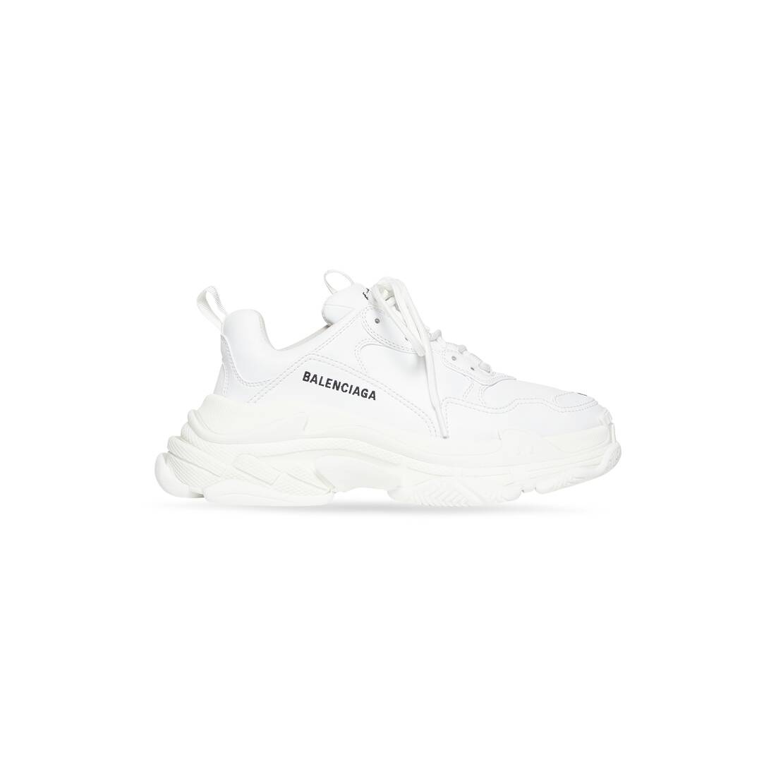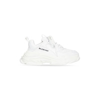Triple S Sneaker in white technical material PRODUCT DETAILS • Sneaker • Fake leather • Complex 3-layered outsole • Embroidered size at the edge of the toe • Embroidered logo on the side • Embossed logo in the back • Triple S rubber branding on the tongue • 2 laces loops including 1 functional • Athletic lacing system featuring 12 fabric eyelets • 1 additional pair of laces • Back pull-on tab and tongue pull-on tab • Made in China • Wipe with a soft and dry cloth Material: 95% polyurethane, 5% polyester