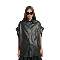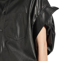 Tucked Sleeves Shirt in black shiny smooth lambskin PRODUCT DETAILS • Shiny smooth lambskin • Shirt collar • 6 button front • 1 patch pocket at chest • Short sleeves tucked inside effect • Rounded hem • Made in Turkey Main material: Lambskin