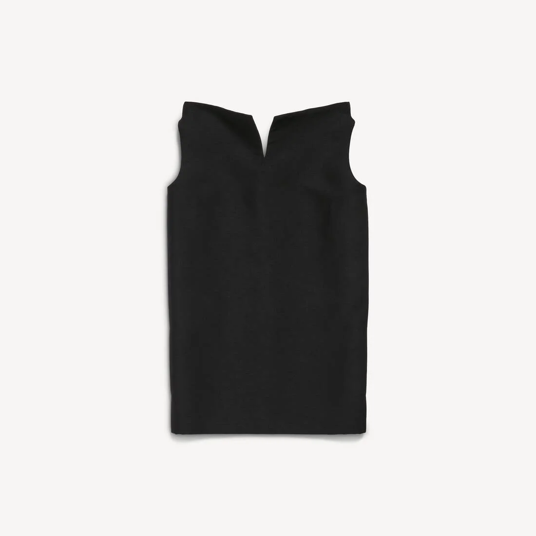 Vareuse Dress in black wool scuba is from look 2 of Balenciaga's Summer 26. PRODUCT DETAILS • Wool scuba • Vareuse design, paying homage to Cristobal Balenciaga • Mini dress • High front neckline with a small V-neck • Sleeveless design • Open back with a deep V-neckline • Voluminous, structured back panels • 2 front slash pockets integrated into the seams • Square hemline • Made in Italy Main material: 48% wool, 29% silk, 24% polyester