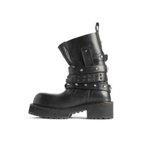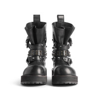 Venom City Bootie in black worn-out calfskin PRODUCT DETAILS • Calfskin • Boot • Extra round toe • 20mm arch • Worn-out effect • Adjustable straps with belt buckles and aged-silver studs • Balenciaga and 10 AV George V 75008 Paris logo debossed on the upper • Plate with Balenciaga logo engraved on exterior outsole • Thick toothed rubber outsole • Loop at back • Made in Italy Upper: calfskin - Sole: micro, TPU, calfskin, zamak - Insole: calfskin
