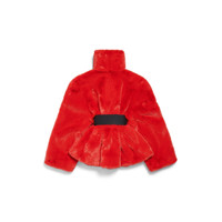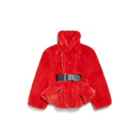 Wrap Animal-Free Fur Coat in red synthethic fabric for Women PRODUCT DETAILS • Recycled polyester, mink fur effect • Stand-up collar • Long kimono sleeves • Inner hooks • Belted • Made in Italy Main material: 100% polyester