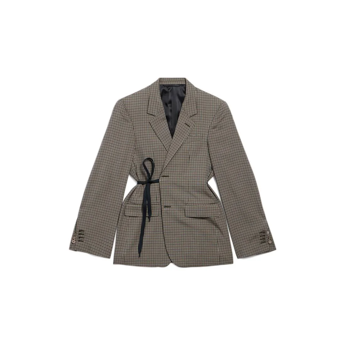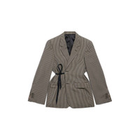 Wrap Tailored Jacket in khaki and brown fluid check lyocell PRODUCT DETAILS • Fluid check lyocell • Notch lapel • 2 button single-breasted front • Wrap-around construction • Knotted at waist with drawstring • 2 flap pockets at front • 4 button cuffs • 1 vent at back • Made in Italy Main material: 100% lyocell