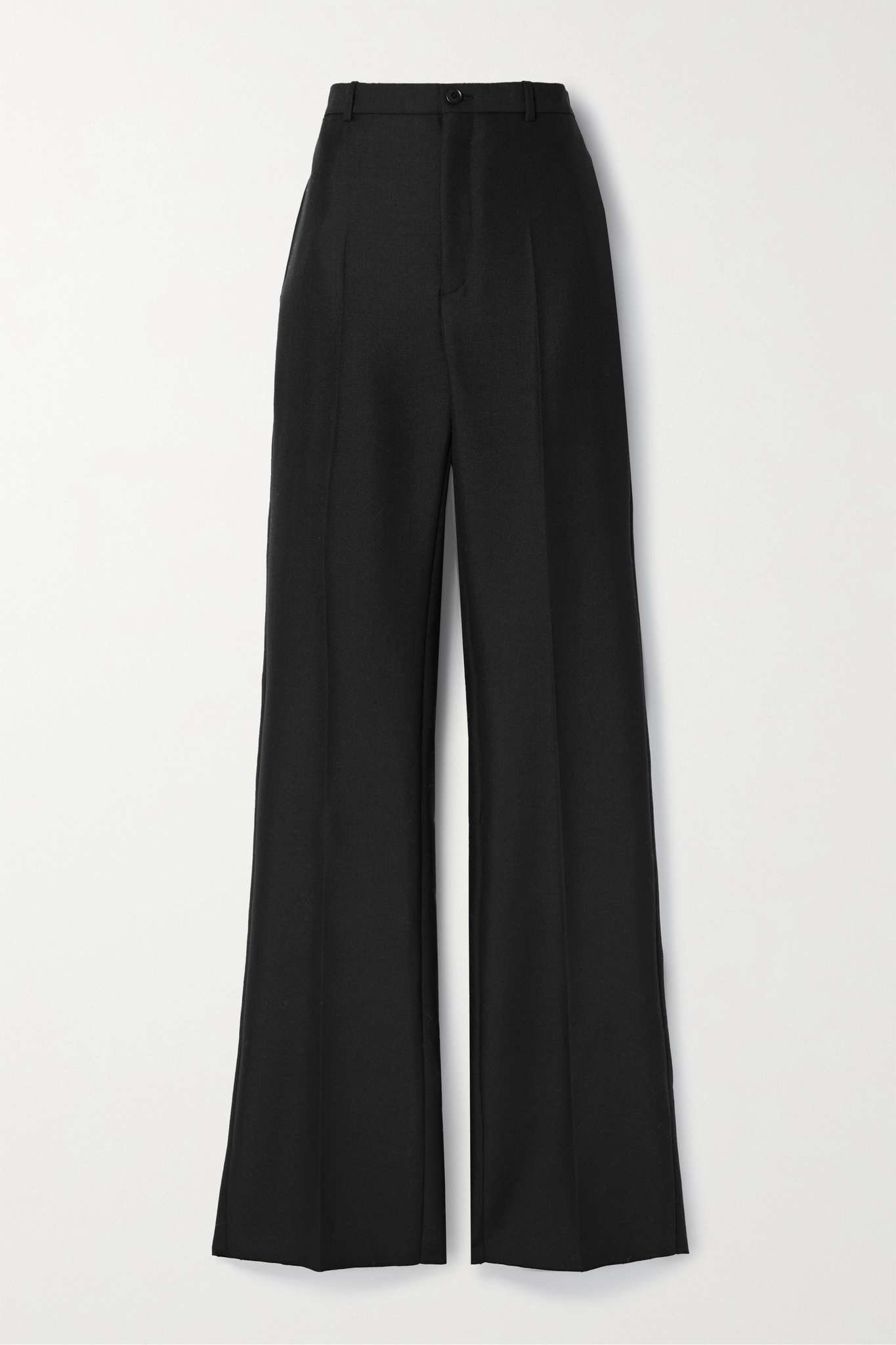 EDITORS'NOTES Balenciaga's versatile black pants are woven from a wool and mohair-blend, making them ideal for the cooler months. They're designed with a high-rise waist and wide, creased legs that pool at the floor. Wear yours with anything from an oversized blouse to a slim collared shirt. SIZE & FIT - Fits true to size, take your normal size - High-rise, cut for a wide-leg fit - Lightweight, non-stretchy fabric - Model is 180cm/ 5’11” and is wearing a FR 36 DETAILS & CARE - Black wool and mohair-blend - Button and concealed zip fastening at front - 60% wool, 40% mohair; trim: 100% cupro; lining: 100% cotton - Dry clean