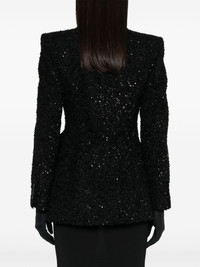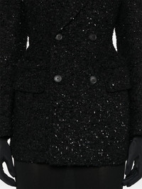 double-breasted boucle blazer Highlights - Black - Wool blend - Tweed - Boucle design - Peak lapels - Shoulder pads - Long sleeves - Buttoned cuffs - Two front flap pockets - Two side inset pockets - Straight hem - Full lining - Double-breasted button fastening Made in Italy Composition Outer: Wool 54%, Polyamide 39%, Polyester 7% Lining: Cupro 100%, Cotton 100% SIZE & FIT Model measurements Height 5 ft 11 in(1.8 m) Bust/Chest 33.07 in(84 cm) Hips 37.4 in(95 cm) Waist 25.19 in(64 cm) Measurement SLEEVE LENGTH 25 in(63.5 cm) LENGTH 30 in(76.2 cm) WAIST 32 in(81.3 cm) BUST 34.01 in(86.4 cm) FittingInformation Designed for a slim fit that sits just away from the body offering a close yet comfortable fit The internal shoulder pads offer a structured shape Made from a midweight non-stretch fabric This piece fits true to size – take your usual size