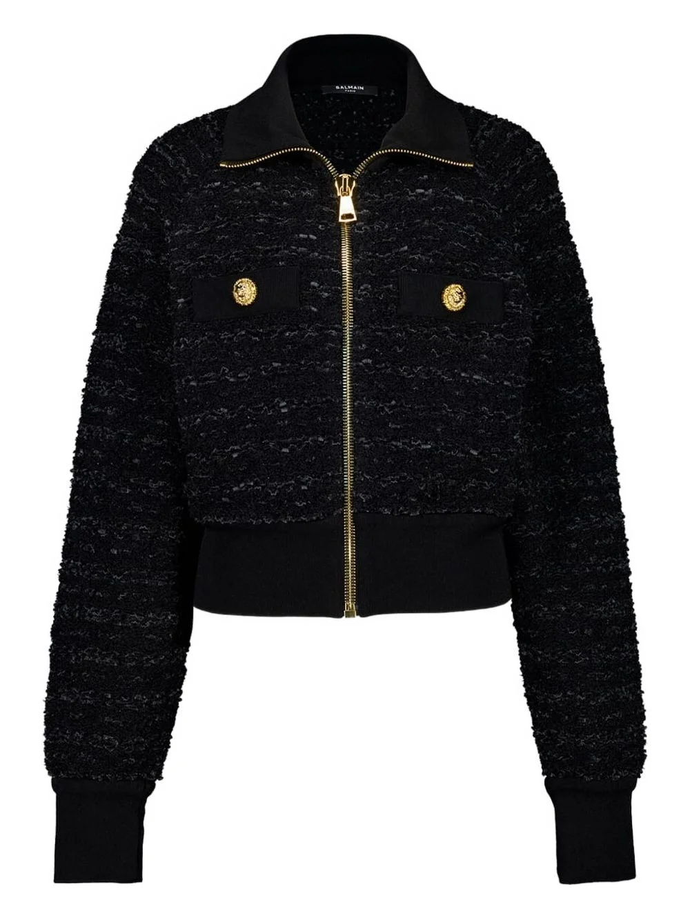 zip-up tweed jacket Highlights - Black - Gold-tone hardware - Zipped fastening - Two front pockets - Tweed effect Imported Composition Viscose 55%, Other Materials 13%, Polyamide 10%, Cotton 8%, Wool 8%, Polyester 6% Washing instructions Read Manufacturer Guidelines
