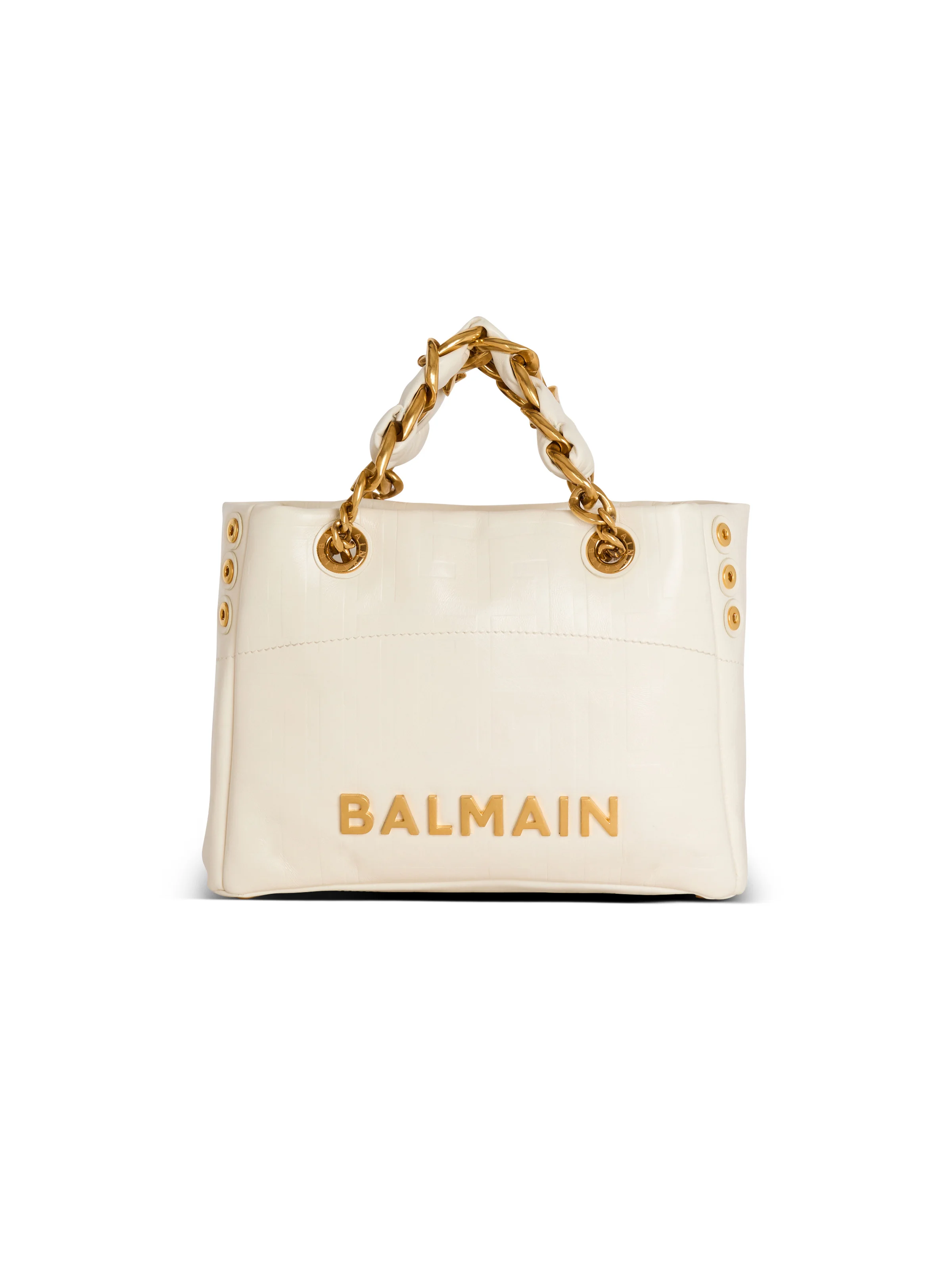 Small 1945 Soft bag in embossed crackled calfskin with a PB Labyrinth monogram - Carry in the hand or wear on the shoulder - Metal Balmain logo - Adjustable side gussets, 3 press studs - Double handles in leather and chains interlaced with leather - Engraved eyelets - Magnetic clasp - Twill lining - Inside pockets with press studs - Leather card pocket - Reinforced bottom - Metal bag feet - Gold hardware - Dimensions: 21 x 28 x 9.8 cm - Main material: 100% calfskin leather - Made in Italy - Item: DN0FD871LETF