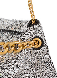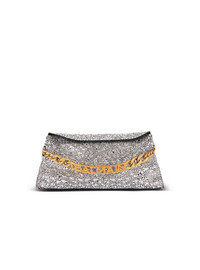 1945 Soft suede and rhinestone clutch - Carry in the hand, on the shoulder or across the body - Metal chain handle and Balmain logo - Removable chain shoulder strap with leather and snap hooks - Eyelets on the sides - Magnetic fastening - Leather lining - Inside patch pocket - Embossed leather card pocket - Gold hardware - Dimensions: 31 x 13 x 5.5 cm - Main material: 100% goatskin - Made in Italy - Item: EN1LQ955AHXS