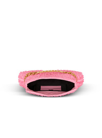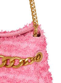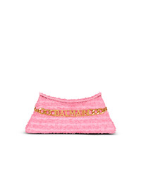 1945 Soft clutch bag in tweed-effect raffia - Carry in the hand, on the shoulder or across the body - Metal chain handle with Balmain logo - Removable chain shoulder strap with interlaced leather and snap hooks - Eyelets on the sides - Magnetic fastening - Twill lining - Inside patch pocket - Embossed leather card pocket - Gold hardware - Dimensions: 31 x 13 x 5.5 cm - Main material: 86% polyamide 14% cotton - Made in Italy - Item: EN0LQ955TRWE