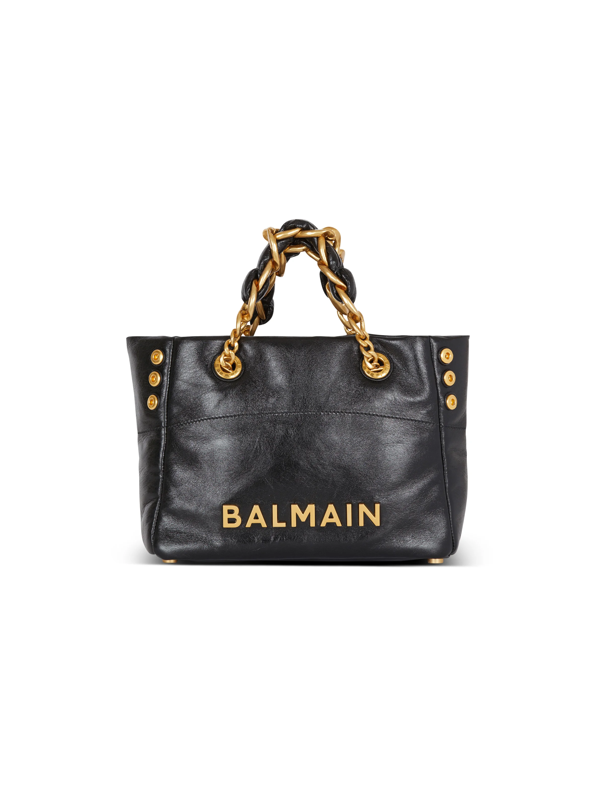 1945 Soft crinkled leather shopper - Metal Balmain logo - Adjustable press-stud sides - Lobster clasp and Balmain embossed leather label - Leather interlocking chain handles - Zipped pocket on the inside - Reinforced bottom, metal bag feet - Golden hardware - Comes with a protective cover - Dimensions: 40 x 30 x 13.5 cm - Main material: 100% lambskin leather - Made in Italy - Item: CN1FD871LPPL