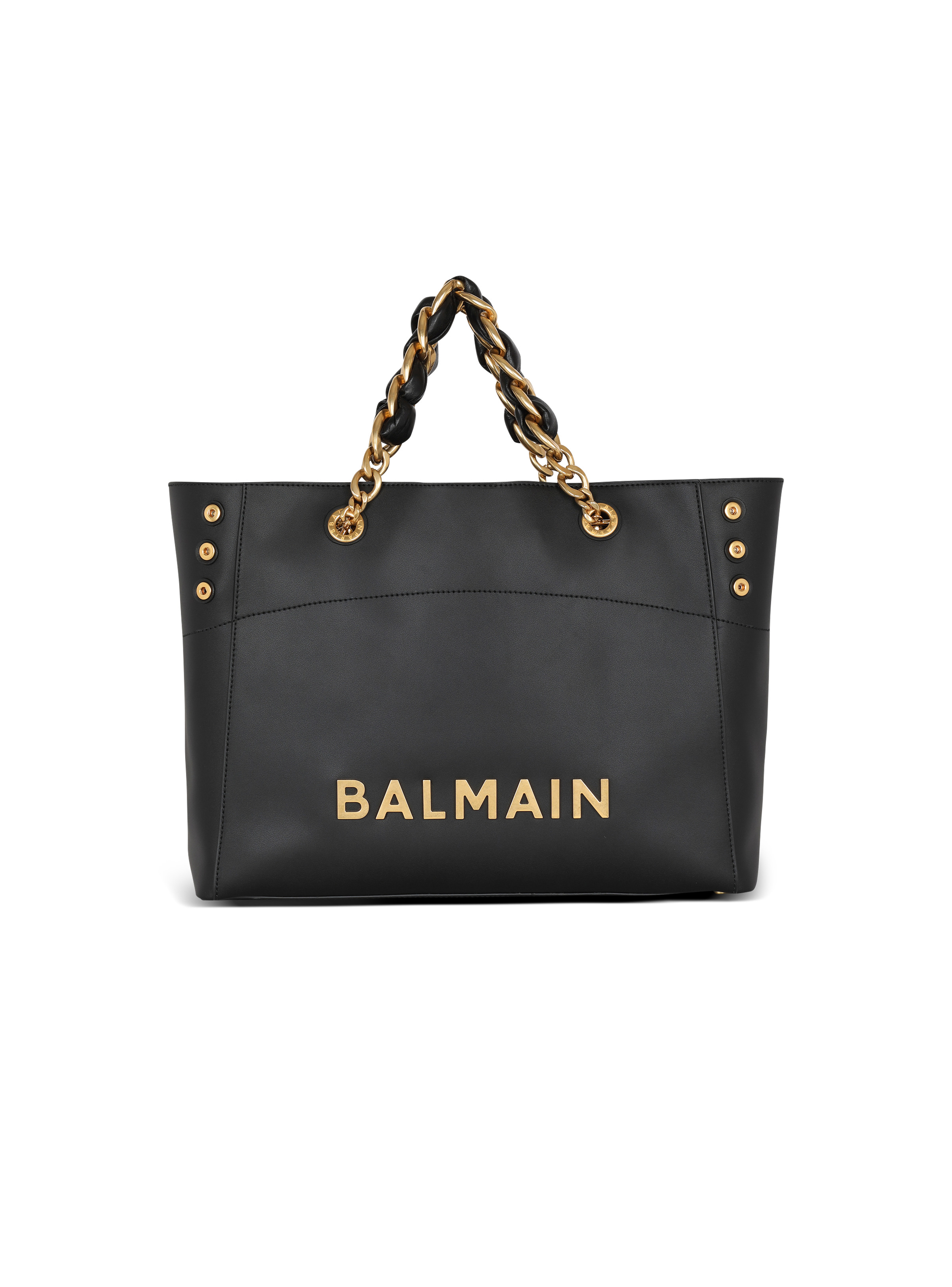 1945 Soft smooth leather tote bag - Metal Balmain logo - Adjustable sides with snap fasteners - Lobster clasp and Balmain embossed leather label - Terry cloth handles and chain intertwined with smooth leather - Zipped pocket on the inside - Reinforced bottom, metal bag feet - Golden hardware - Comes with a protective cover - Dimensions: 40 x 30 x 13.5 cm - Main material: calfskin - Made in Italy - Item: CN1FF827LARN