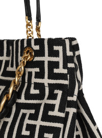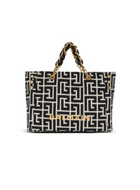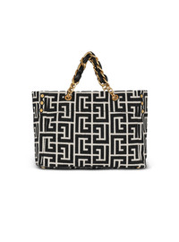 1945 Soft tote bag in jacquard canvas with a PB Labyrinth monogram - Carry in the hand or wear on the shoulder - Metal Balmain logo - Adjustable side gussets, 3 press studs - Double handles in leather and chains interlaced with leather - Engraved eyelets - Magnetic clasp - Suede-look lining - Inside zipped pocket - Leather card pocket - Reinforced bottom - Metal bag feet - Gold hardware - Dimensions: 40 x 30 x 13.5 cm - Main material: 84% cotton 16% polyester - Made in Italy - Item: EN1FF827TJXN