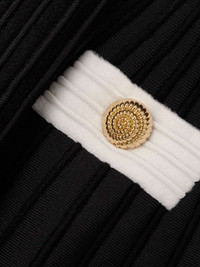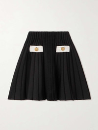 EDITORS'NOTES Balmain's interpretation of the classic skater skirt feels particularly sophisticated. It's knitted with raised seams throughout the flouncy shape and has gold-tone buttons decorating the contrasting trims. Wear yours with the coordinating cardigan. SIZE & FIT Model measurements: - Fits true to size, take your normal size - Mini-length, designed to be worn at the waist - Lightweight knit - Model is 177cm/ 5'10" and is wearing a FR 34 - Bust: 79cm/ 31" - Waist: 61cm/ 24" - Hip: 89cm/ 35" DETAILS & CARE - Black and white viscose, polyamide and elastane-blend - Zip fastening along back - 65% viscose, 34% polyamide, 1% elastane
