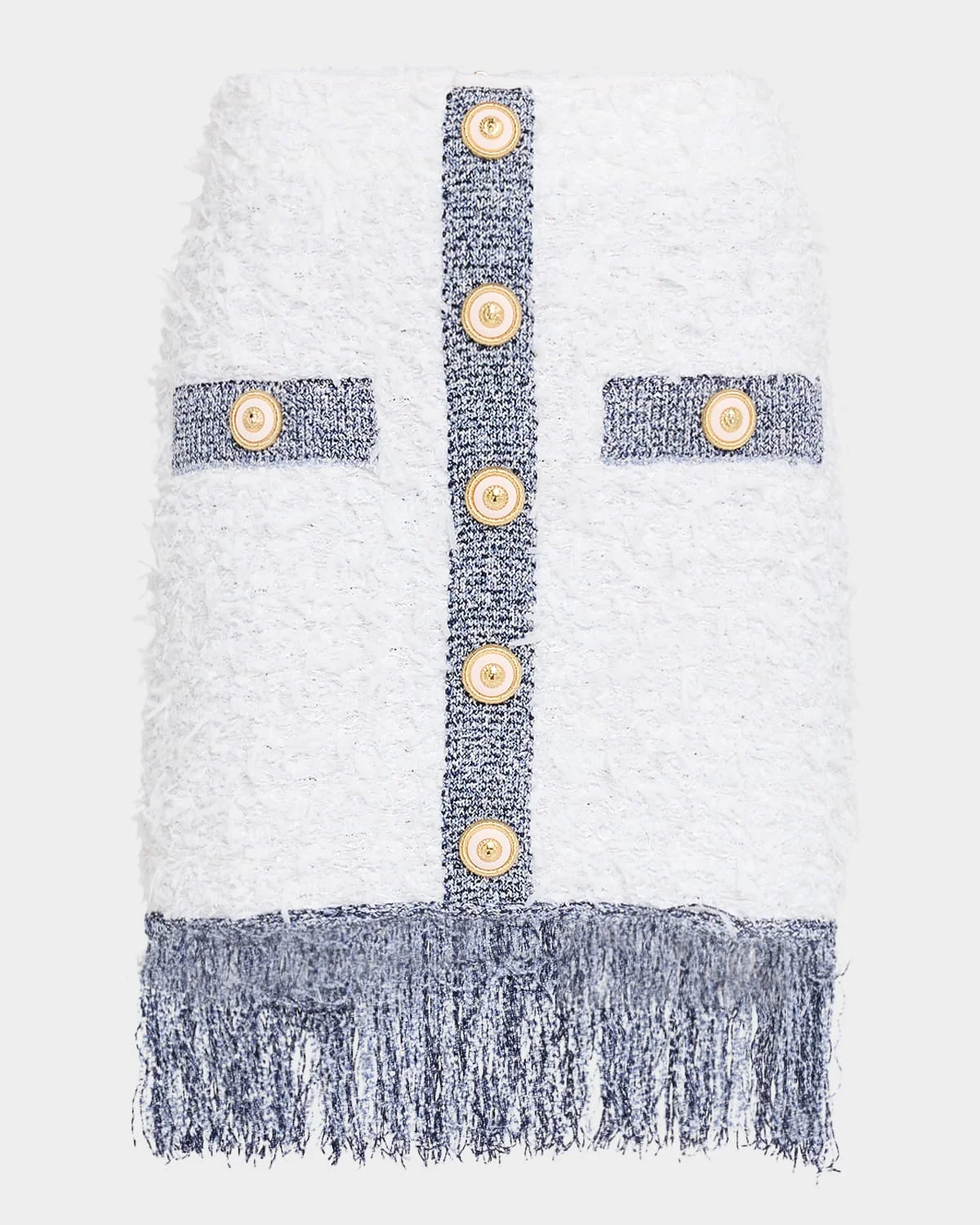 - Balmain eyelash tweed skirt fetauring contrast metallic fringed hem, a signature button front, and side button-welt pockets - High waist - Mid-thigh length - Pencil silhouette - Back zip - Nylon/polyamide - Professional cleaning recommended - Made in France