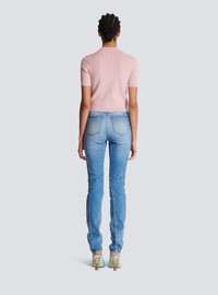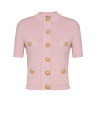 Fine ribbed knit cardigan with buttons - Fitted cut - V-neck - Structured shoulders, short sleeves - Front fastening with 4 "Signature Coin" gold metal buttons - 2 fake pockets - Model measures 179cm and wears a size 36 - Main material: 83% viscose 17% polyester - Made in France - Item: DF1KL023KB07100% of the viscose fibres used to make this garment come from certified, sustainably managed forests