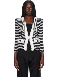 Nylon- and cotton-blend tweed jacket. Stripes throughout. · Y-neck · Open front · Patch pockets · Padded shoulders · Full twill lining · Logo-engraved black- and gold-tone hardware Supplier color: Noir/Blanc Body 1: 50% polyamide, 45% cotton, 5% acrylic. Body 2: 100% polyamide. Lining: 52% viscose, 48% cotton. Made in Poland 242251F063006