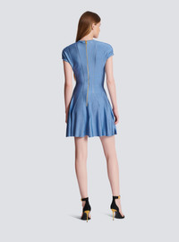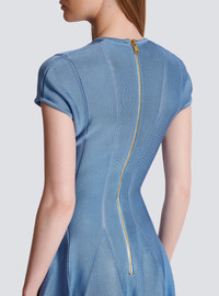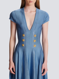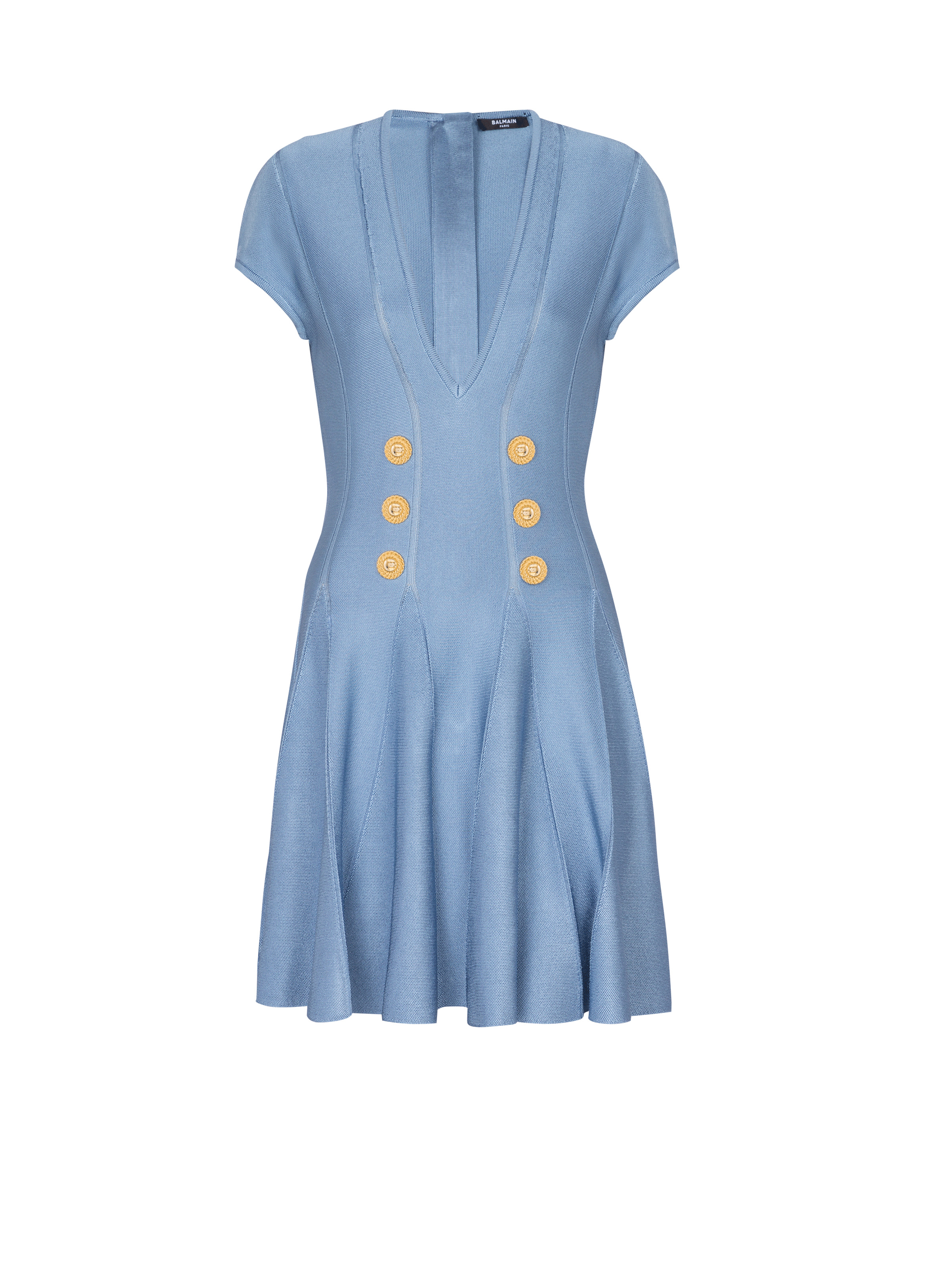 6-button fine knit dress - “Balmain Chain” golden metal buttons - Nipped in waist, skater skirt - V-neckline - Short sleeves - Model measures 180cm and wears a size 36 - Main material: 100% viscose - Made in France - Item: CF1R7167KB41
