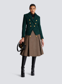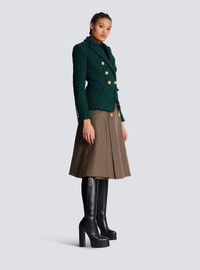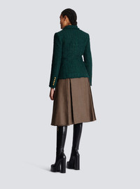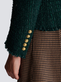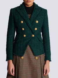 Double-breasted tweed jacket - Tight fit, marked waist - Darts on the front - Tailored neckline with peak lapels - Structured shoulders, long sleeves - 6 golden metal 'Lion Head' buttons, 5 of which are decorative - 2 flap pockets, 1 welt pocket - Tailored cuffs, 5 flat golden metal 'Lion Head' buttons - Model measures 176cm and wears a size 36 - Material: 79% polyamide, 15% virgin wool, 6% cotton - Made in Poland - Item: BF1SG165XF91