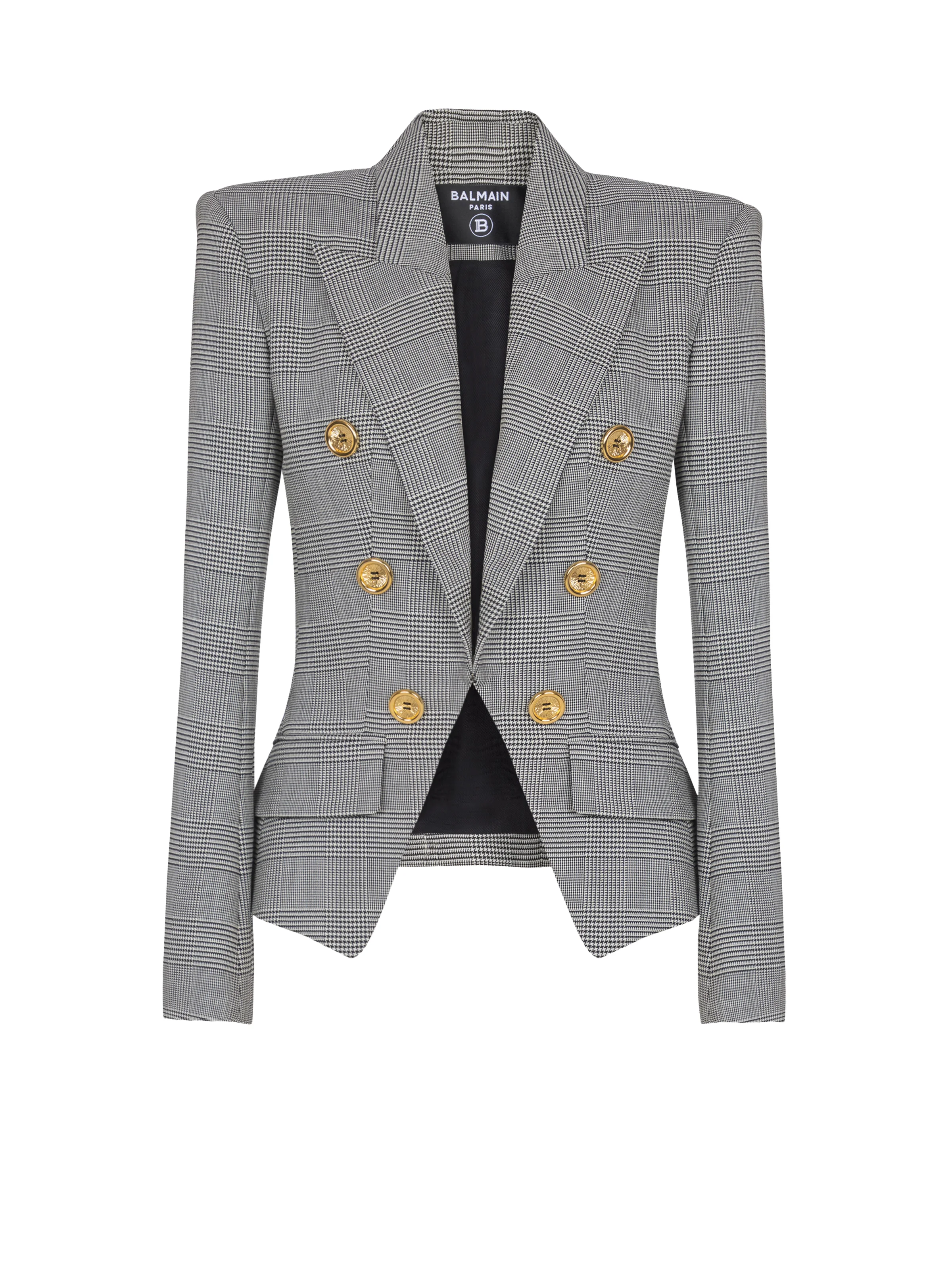 6-buttons jacket in Prince of Wales jacquard - Italian tailored collar - Long sleeves - Structured shoulders - Buttoned cuffs - Welt side pockets with a flap - Edge-to-edge fastening with "Sewing Thread" buttons - Tailored fit - Model measures 175cm and wears a size 36 - Main material: 95% virgin wool 4% polyamide 1% elastane - Made in Bulgaria - Item: GF1SM340WD31100% of the wool fibres used to make this garment are sourced from sheep farms that are certified and animal welfare-friendly