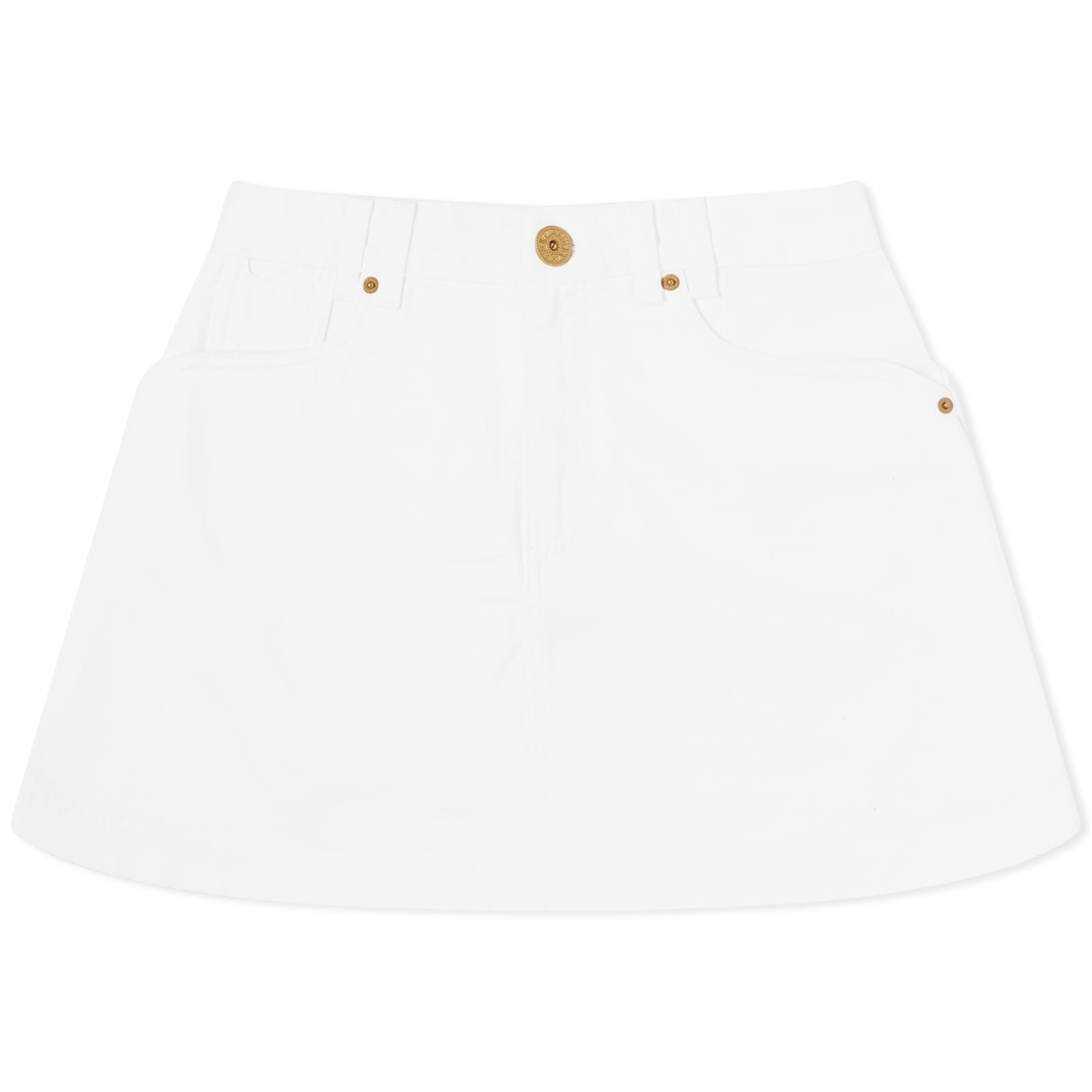 Now under the creative direction of Oliver Rousteing, Balmain revives elegant silhouettes reworked for the modern wardrobe. Inspired by Western style, this denim short skirt is cut from a durable cotton that guarantees longevity. For a premium finishing touch, gold tone button detailing rounds off the design. - 100% Cotton - Belt Loops - Zip Fly - 5 Pocket Detailing