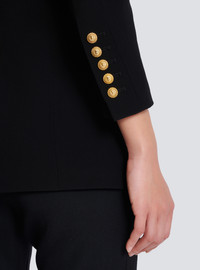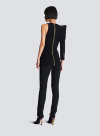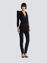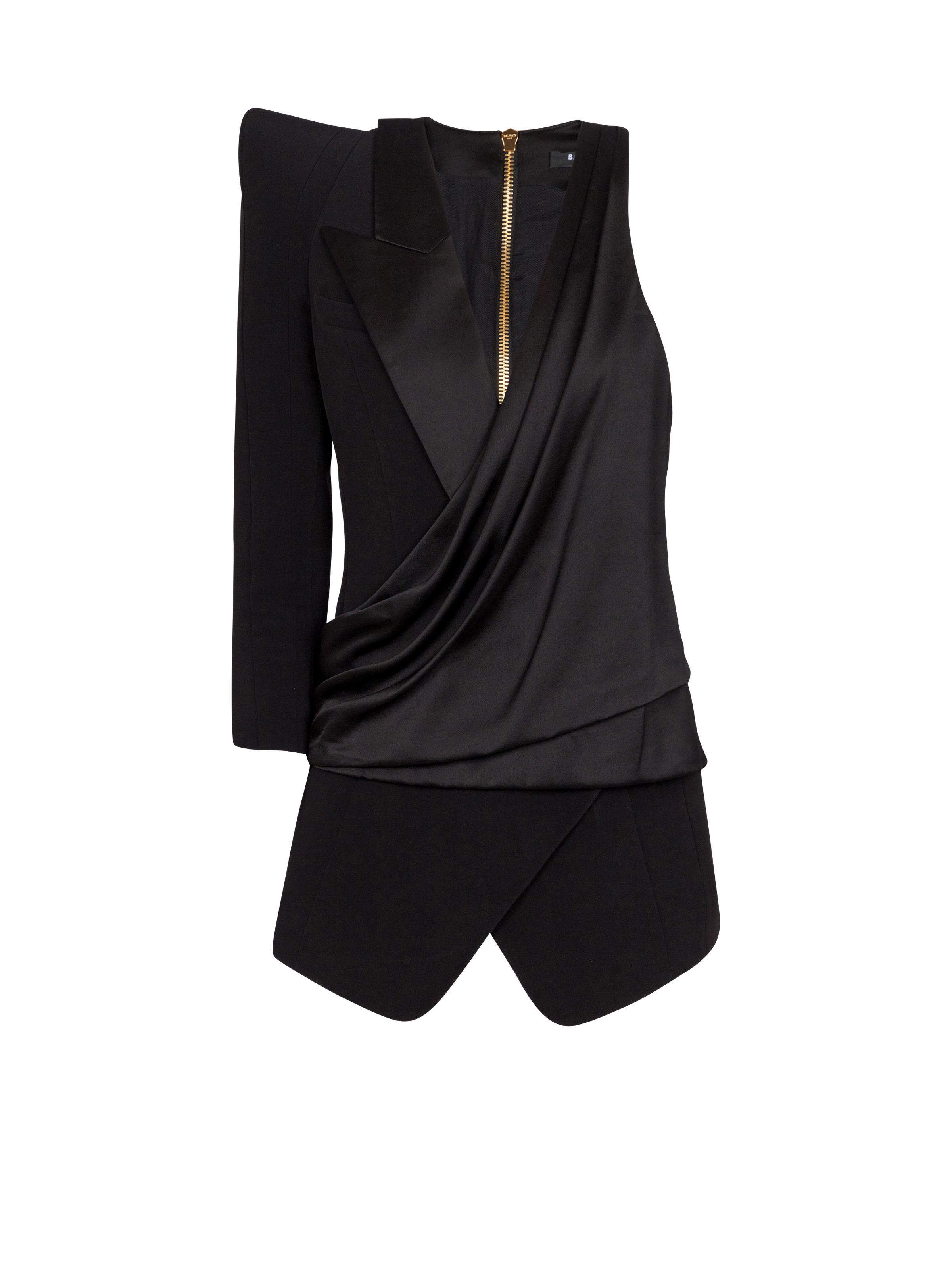 Asymmetric dress with structured shoulder - Deep V-neckline - Italian tailored half collar - Tone-on-tone satin lapels - Draped satin panel - Pagoda shoulder - Long sleeve - Straight cuff with 5 "Double Chain Lion" buttons in gold metal - Visible gold metal zip fastening on the back with Balmain Paris-engraved slider - Twill lining - Short slim fit - Model measures 178cm and wears a size 36 - Main material: 100% viscose - Made in Slovakia - Item: EF0AQ120MF01100% of the viscose fibres used to make this garment come from certified, sustainably managed forests
