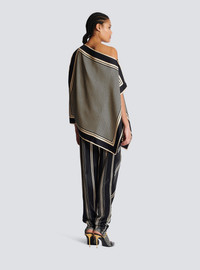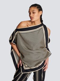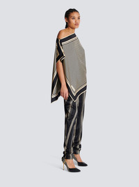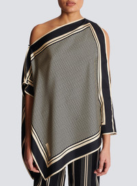 Asymmetric scarf top with mini monogram print - Relaxed, flowing fit - Off-the-shoulder neckline - Contrasting edging - Pierre Balmain label detail printed on the front - Hand-finished - Size 1: 34 - 36 - Size 2: 38 - 40 - Size 3: 42 - 44 - 46 - Model measures 176cm and wears a size 1 - Material: 100% silk - Made in Italy - Item: BF1AT070SC76