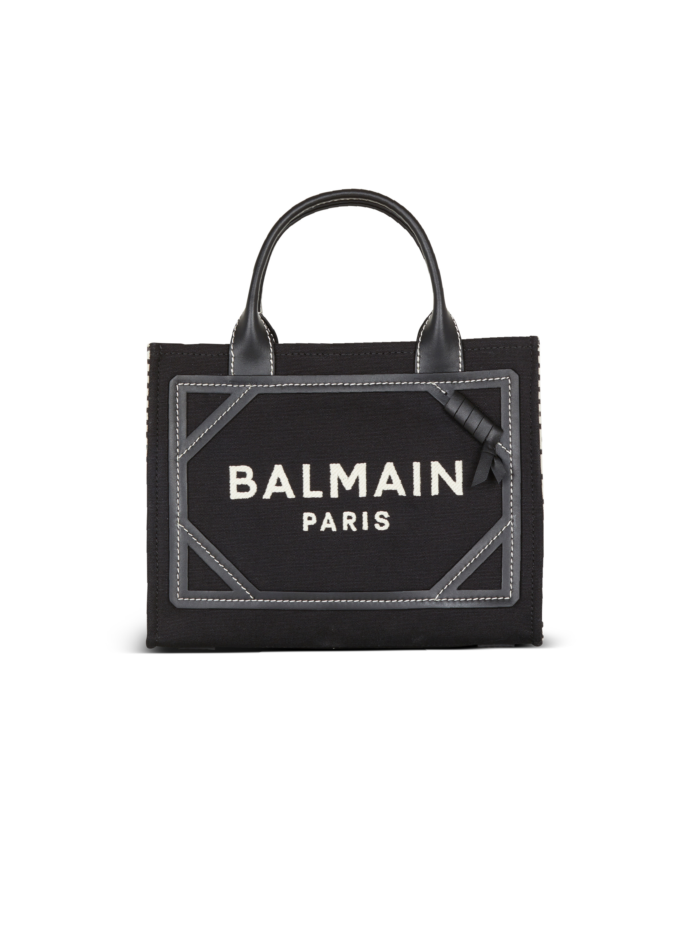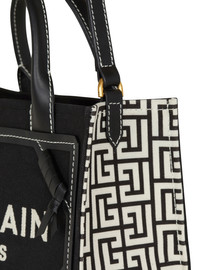 B-Army small canvas bag with leather details - Tote bag shape - Leather handles and adjustable shoulder strap - Leather inserts and embroidered Balmain Paris logo - Balmain engraved lobster clasp at the top of the bag - Patch pocket and embossed logo on the inside - Leather bag feet - Golden hardware - Comes with a protective cover - Dimensions: 32.5 x 26 x 8.5 cm - Material: 100% cotton, calfskin - Made in Italy - Item: BN1FE809TPAC