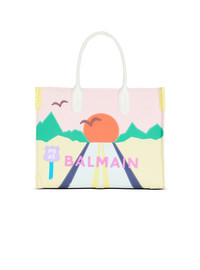 B-Army Shopper Medium tote bag in canvas and Postcard patchwork leather - Carry in the hand or wear on the shoulder - Balmain logo in topstitched leather - Calfskin patchwork on printed canvas - Contrasting leather details sewn on the corners - Leather side gussets - Leather handles - Balmain-engraved snap hook at the top of the bag - Leather palm tree-shaped charm - Inside canvas pocket, Balmain logo in embossed leather - Detachable leather pouch with embossed Balmain logo and press-stud fastening - Canvas lining - Reinforced bottom - Leather bag feet - Gold hardware - Dimensions: 42 x 33.5 x 15 cm - Main material: 100% cotton - Made in Italy - Item: DN1FF919TPCC