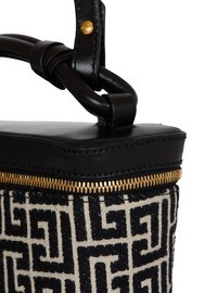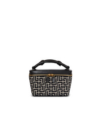 B-Army Vanity Case in PB-monogrammed jacquard canvas and calfskin - Carry in the hand, on the shoulder or across the body - Topstitched leather top - Rounded handle with interlaced leather details - Adjustable buckled shoulder strap to remove using the stud button - Visible double metal zip fastening - Leather slider - Balmain Paris-embossed leather knotted label - Twill patch pocket - Inside leather card pocket, embossed Balmain logo - Twill lining - Gold hardware - Dimensions: 18 x 7.5 x 12 cm - Main material: 84% cotton 16% polyester - Made in Italy - Item: FN1BG022TJGH