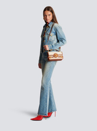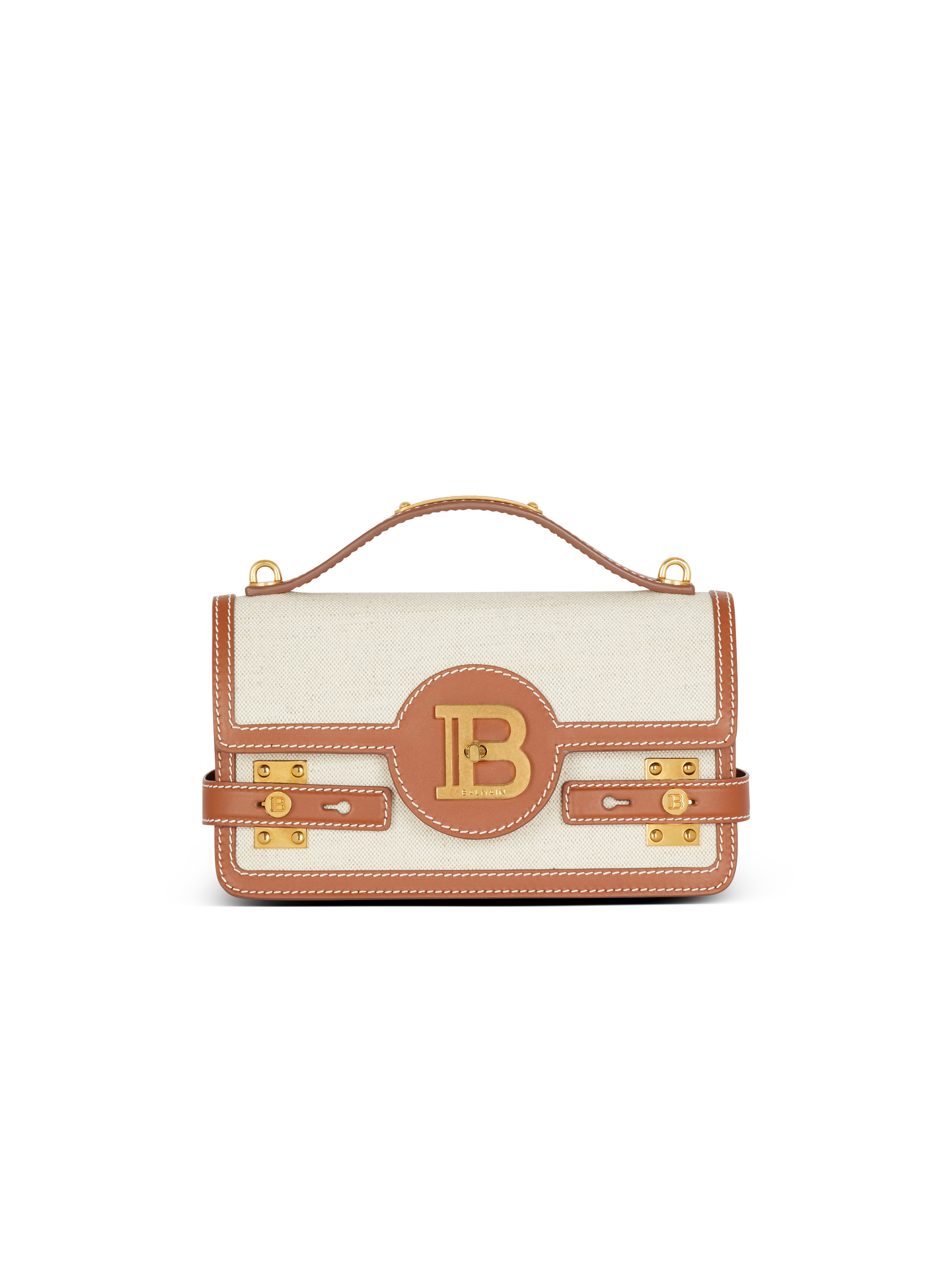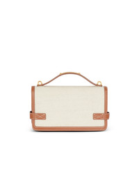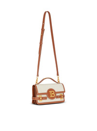 B-Buzz 24 bag in canvas and smooth leather - Thin removable leather shoulder strap and handle - Flap closure with B-Twist clasp - Engraved golden metal Balmain B logo on the front - Engraved golden metal Balmain plaque on the handle - 2 compartments, 1 card holder and a patch pocket on the inside - Golden hardware - Smooth leather lining - Dimensions: 23 x 14 x 8 cm - Main material: 100% calfskin leather - Made in Italy - Item: CN1DA829TCFE
