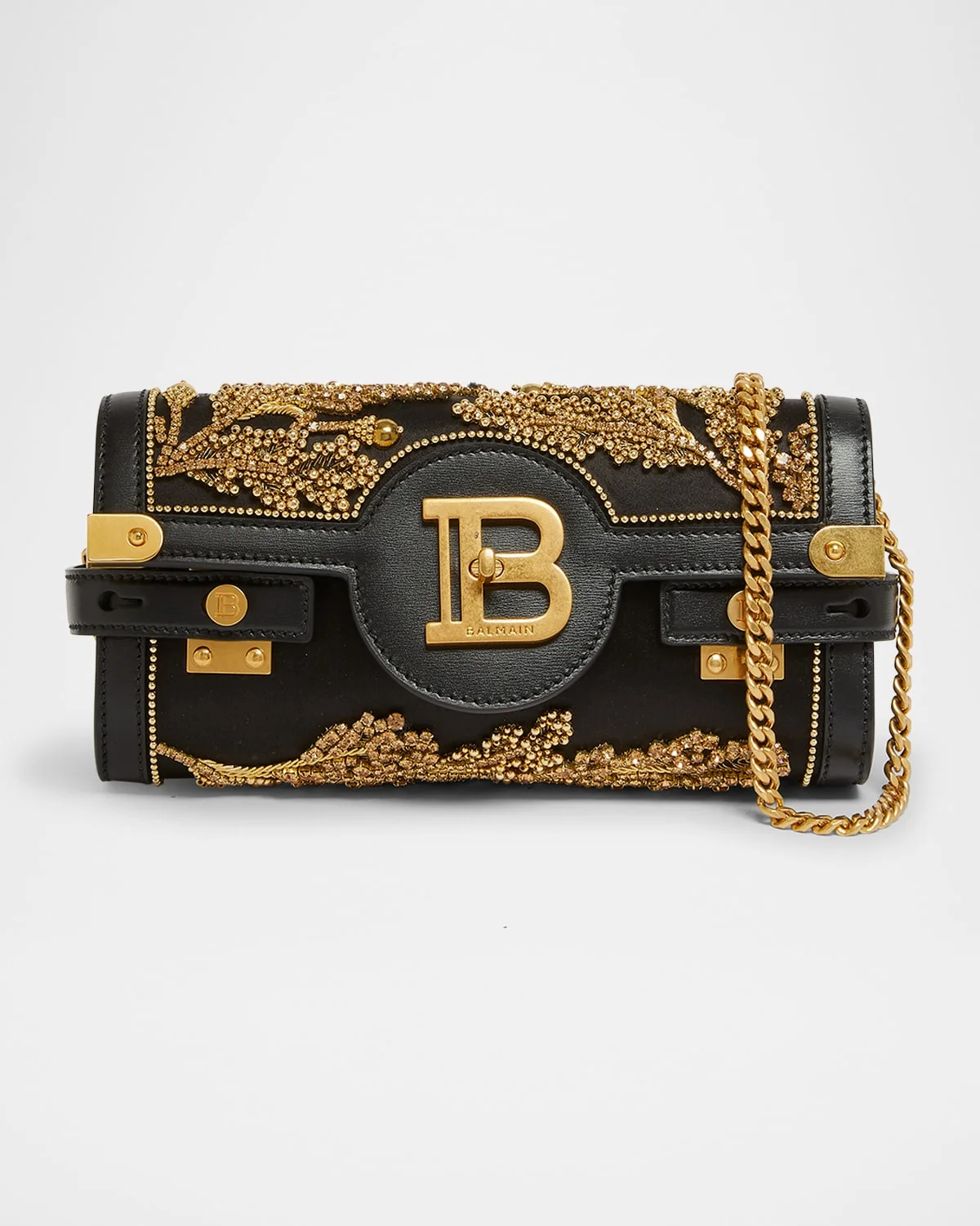 - Balmain "B-Buzz 23" shoulder bag in calfskin leather, adorned with beaded baroque embroidery on satin - Detachable chain shoulder strap - Can be worn as a clutch or shoulder bag - Flap top with B monogram turn-lock closure; side button strap closure - Interior, one card slot - Approx. 4.7"H x 9.1"W x 1.6"D - Spot clean - Made in Italy