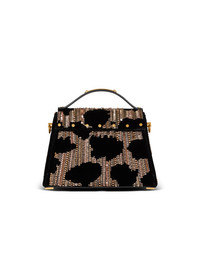 B-Buzz Dynasty bag in embroidered velvet with leopard pattern - Carry in the hand, on the shoulder or across the body - Leather handle, Balmain-engraved plaque - Adjustable and removable shoulder strap with buckle and snap hooks - Flap with quarter-turn B-Twist clasp - Embroidery with beads, sequins and crystals - Leather luggage tag with hidden mirror - Metal bag feet - Inside zipped leather pocket - Embossed leather card pocket - Leather lining - Vintage gold hardware - Dimensions: 23 x 16 x 7 cm - Shoulder strap: 100 cm - Main material: 83% cotton 17% modal - Made in Italy - Item: FN1DB935ALVV
