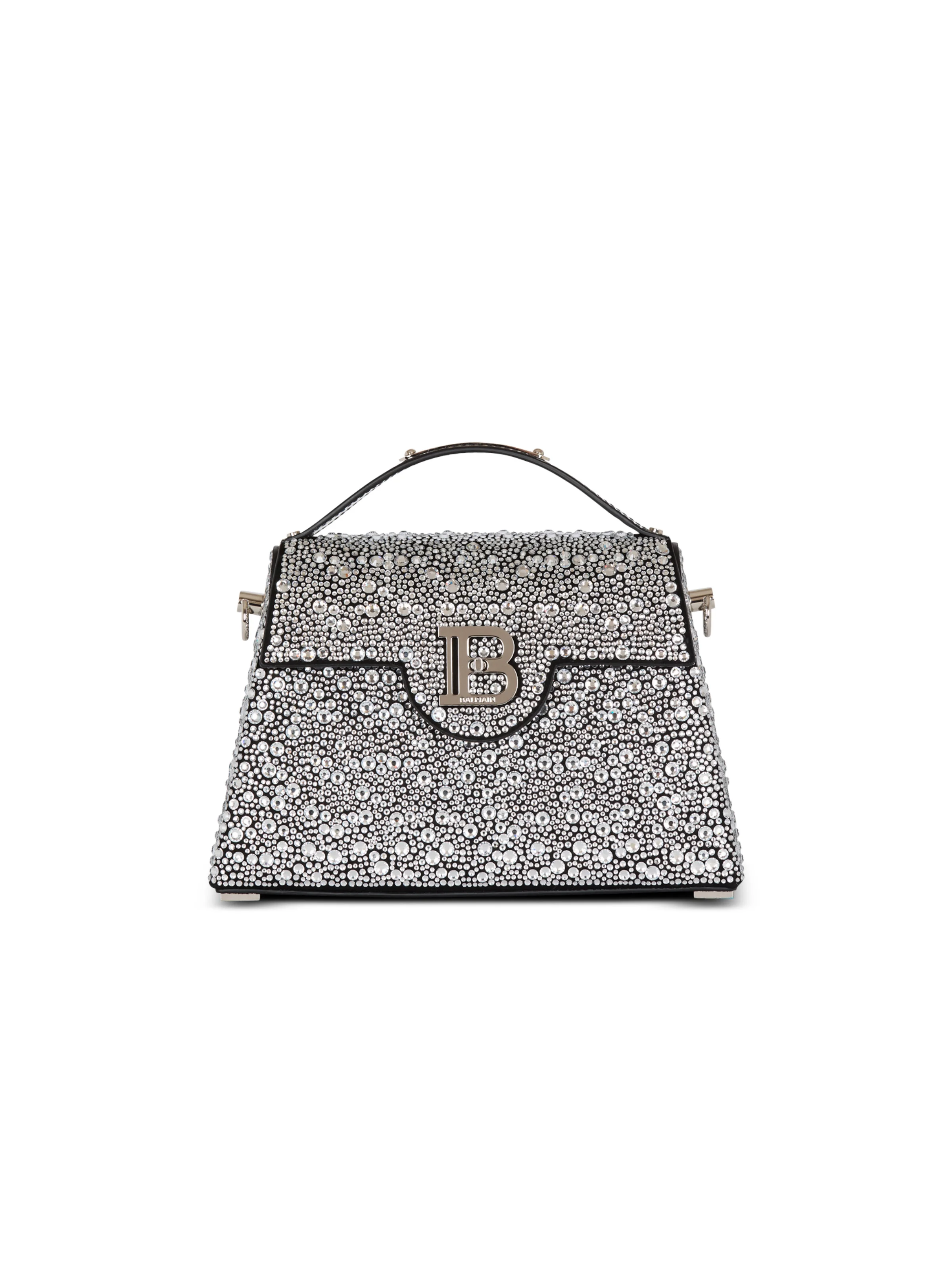 B-Buzz Dynasty bag in suede and rhinestones - Carry in the hand, on the shoulder or across the body - Reflective leather handle, Balmain-engraved plaque - Removable chain shoulder strap with snap hooks - Flap with magnetic B-Twist clasp - Reflective leather patch pocket on the back - Embossed leather card pocket - Leather lining - Metal bag feet - Silver hardware - Dimensions: 16 x 23 x 7 cm - Main material: 100% goatskin - Made in Italy - Item: EN1DB953AHXS