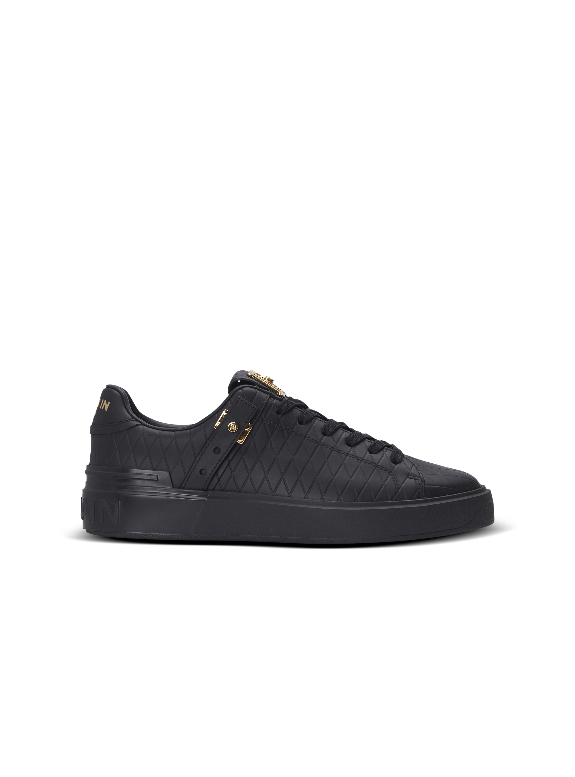 B-Court B-Buzz trainers in diamond-embossed calfskin - Lace fastening with metal details - Metal quarter-turn B-twist clasp - Side straps with B buttons - Embossed Balmain Paris logo on the front - Gold hardware - Thick rubber outsole with raised Balmain logo - Leather lining and insole - Main material: 100% calfskin - Made in Italy - Item: EN1VI738LCGD