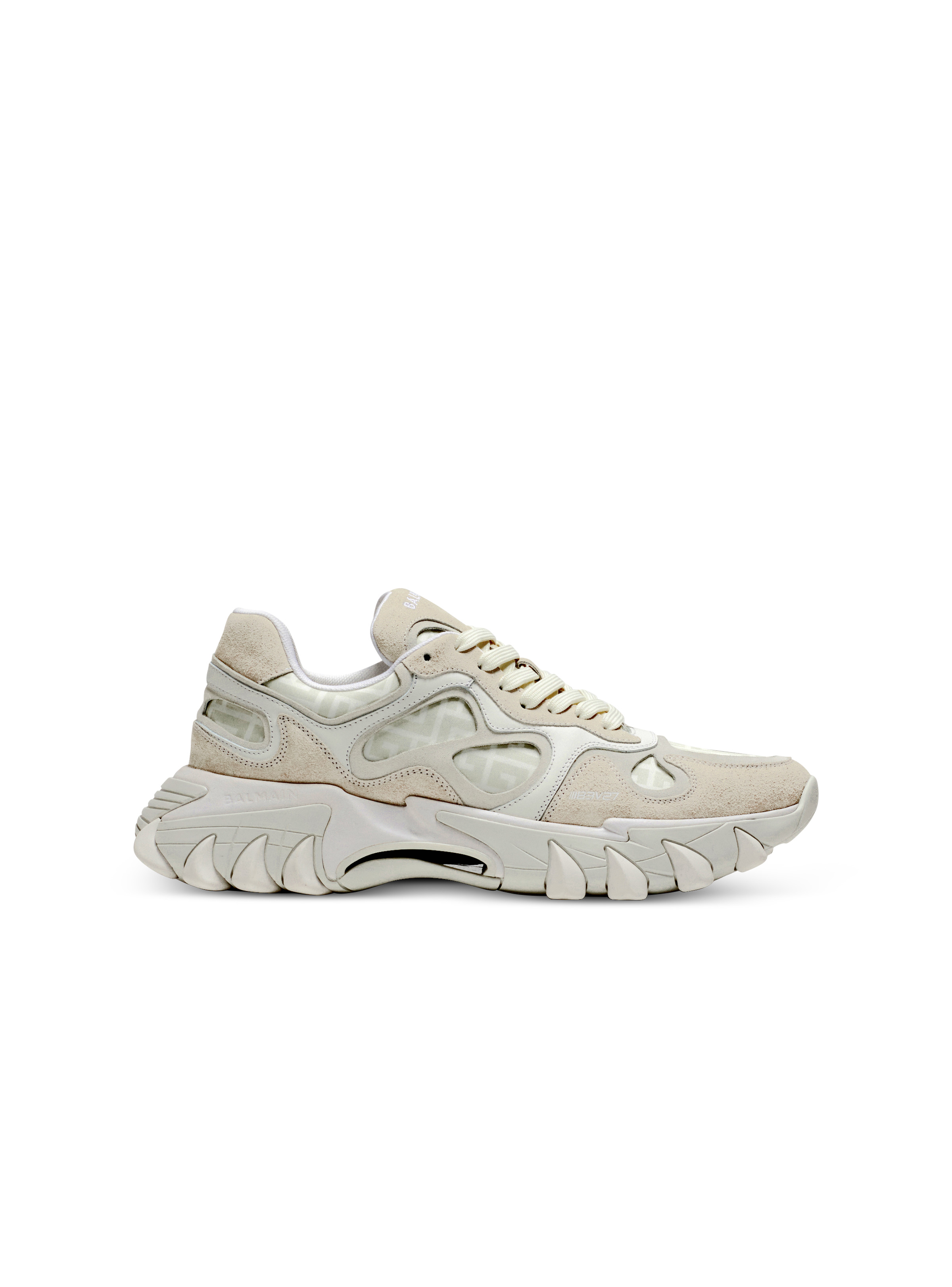 B-East low-top trainers in monogrammed nylon and calfskin - Multi-material model in calf suede, smooth calfskin and nylon fabric - Lace fastening - Embroidered Balmain logo on the tongue - B3V27 logo detail printed on the side - Hollow sole with air-cushion effect, studs - Fabric lining - Smooth leather insole - Sole height: 5.5 cm - Upper height: 6 cm - Material: calfskin - Made in Italy - Item: BN1VI714TNBC
