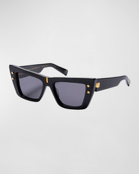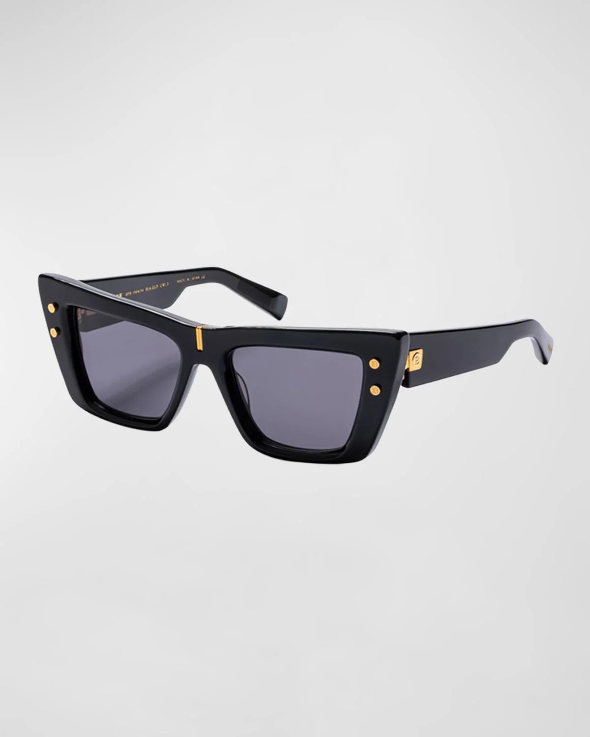 - Balmain "B-Eye" cat-eye sunglasses in acetate with golden hardware - Lens/bridge/temple (in mm): 54-18-145 - Solid lenses - Saddle nose bridge - B-monogram on temples - Thin, tapered arms - Spot clean - 100% UVA/UVB protection - Made in Japan - Proposition 65 warning for California residents